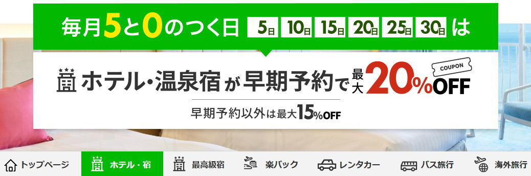 さらに!毎月5と0のつく日には、ホテルや温泉宿が最大22%OFFとなるクーポンを提供しており、定期的にお得なキャンペーンを開催中!